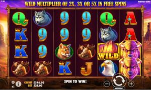 Der Soundtrack besteht aus beruhigender Musik, begleitet von ein paar Banjo-Soundeffekten. Er passt zum Thema und trägt zum ländlichen Flair des Spiels bei. Die Symbole sind ebenfalls sehr interessant. Sie umfassen die regulären Royals mit einem lustigen Design als Symbole mit niedrigem Wert, dann gibt es Wölfe, Adler, Elche, Pumas und Büffel als höchstzahlende Symbole. Eine Klippe dient als Wildsymbol und eine Goldmünze mit einem Büffel als Scatter.